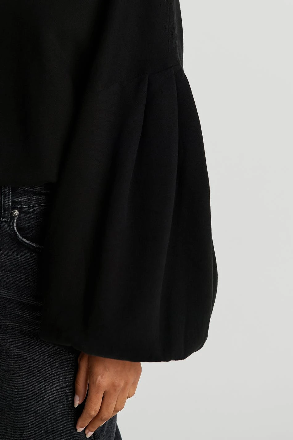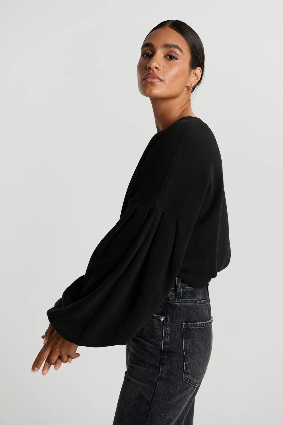 Sweatshirt with an oversize fit. The sweatshirt is black and has balloon sleeves with a cuff on the sleeve ends. It has dropped shoulders with creases.