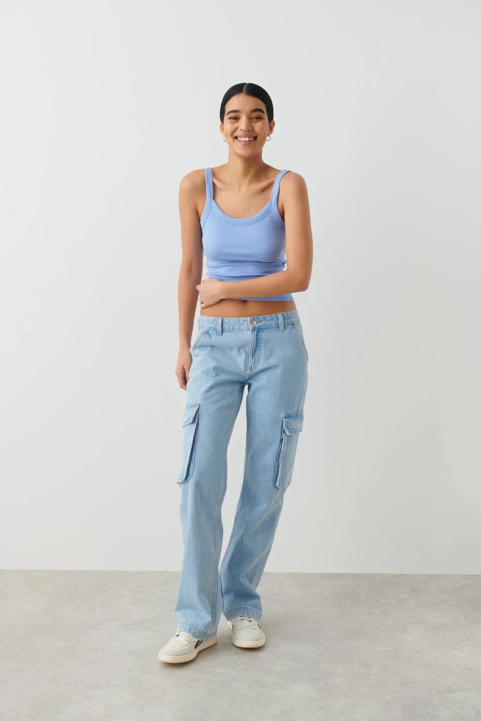 Ribbed tank in jersey with figure-hugging fit. The tank is blue and has ribbed shoulder straps.