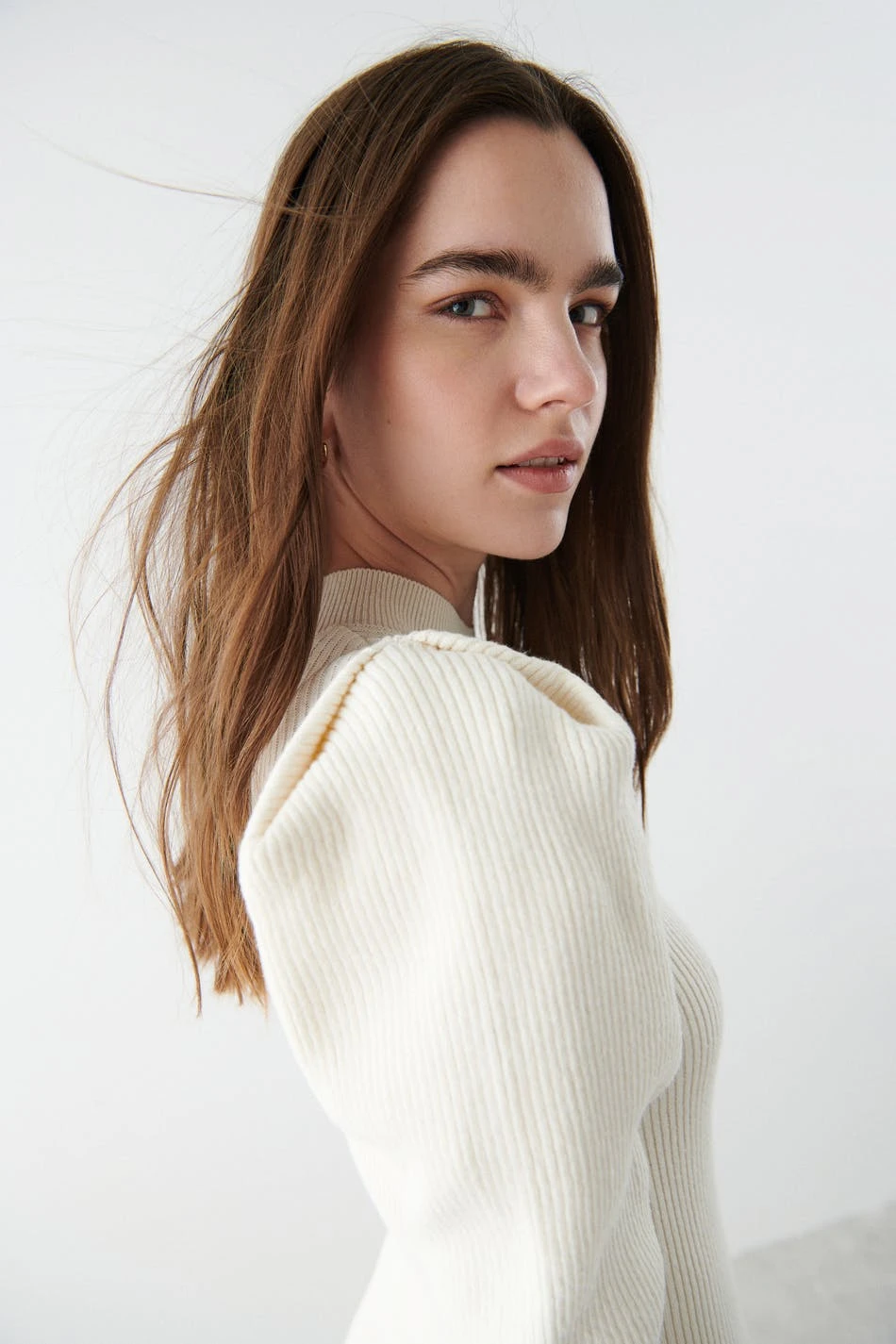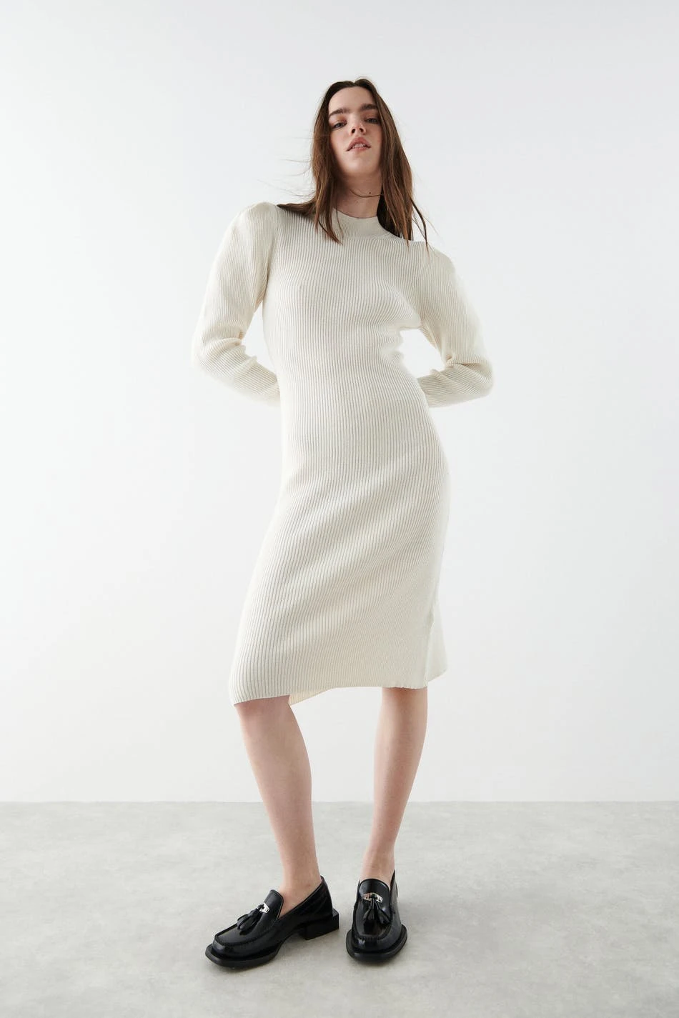 Knitted dress with a tight fit. The dress is beige, knee length and ribbed. It has a high neckline and long puff sleeves.