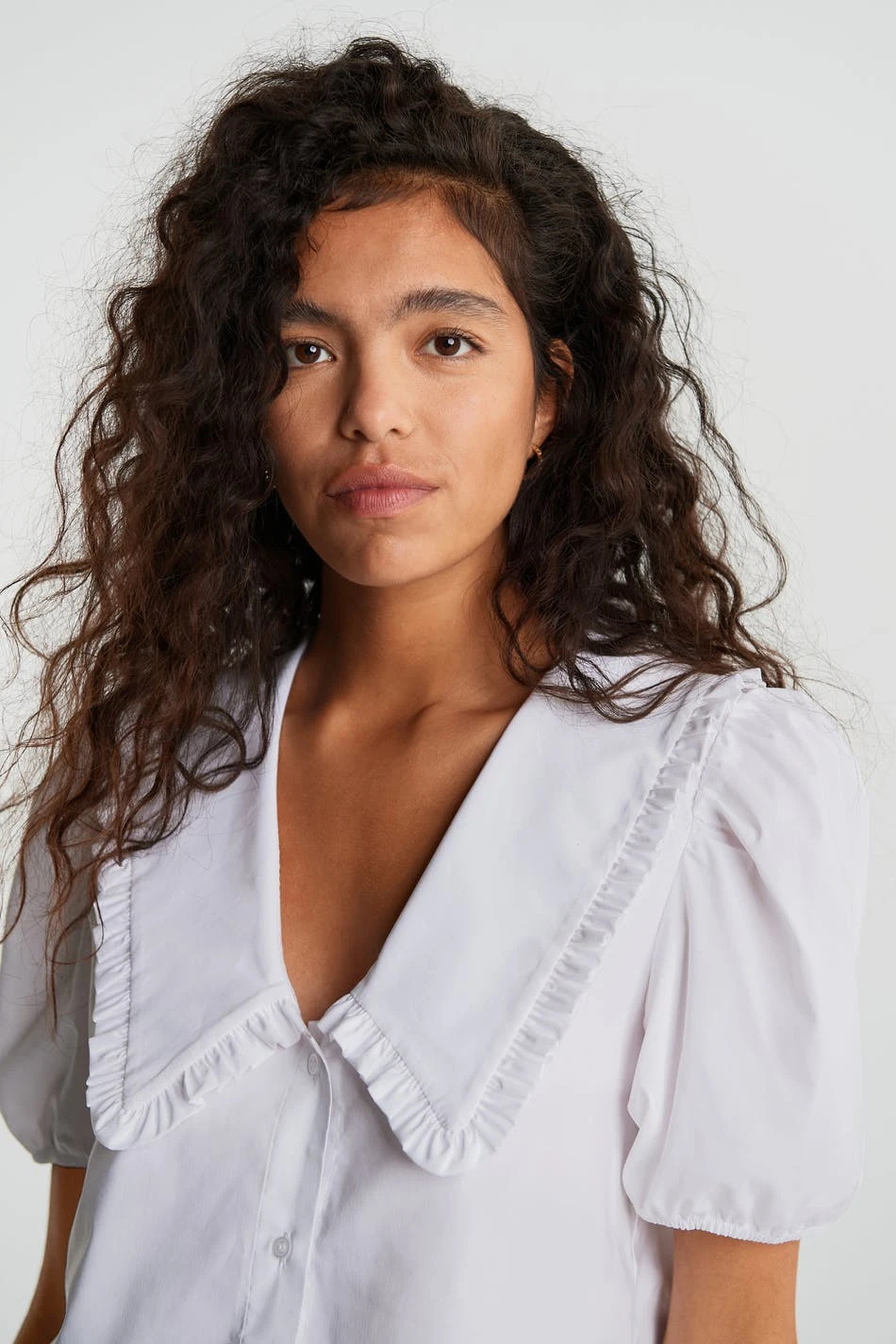 Short blouse with a plunging neckline with ruffle details. The blouse is white and woven and has short sleeves with an elastic band on the sleeve ends. It has buttons at the front.