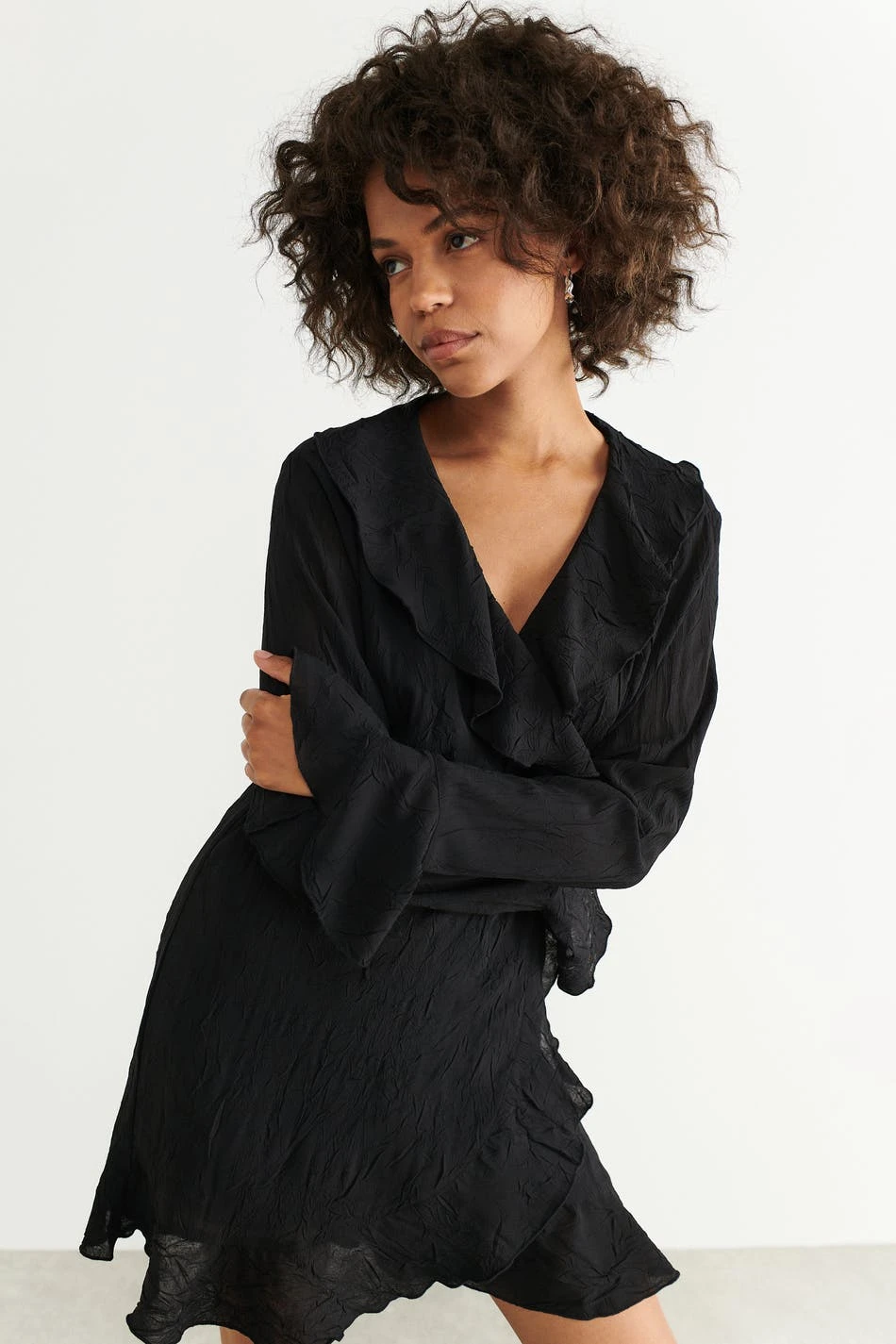Long-sleeved wrap dress in chiffon with self-tie at the front. The dress is black and has an airy woven fabric. It has midi length.