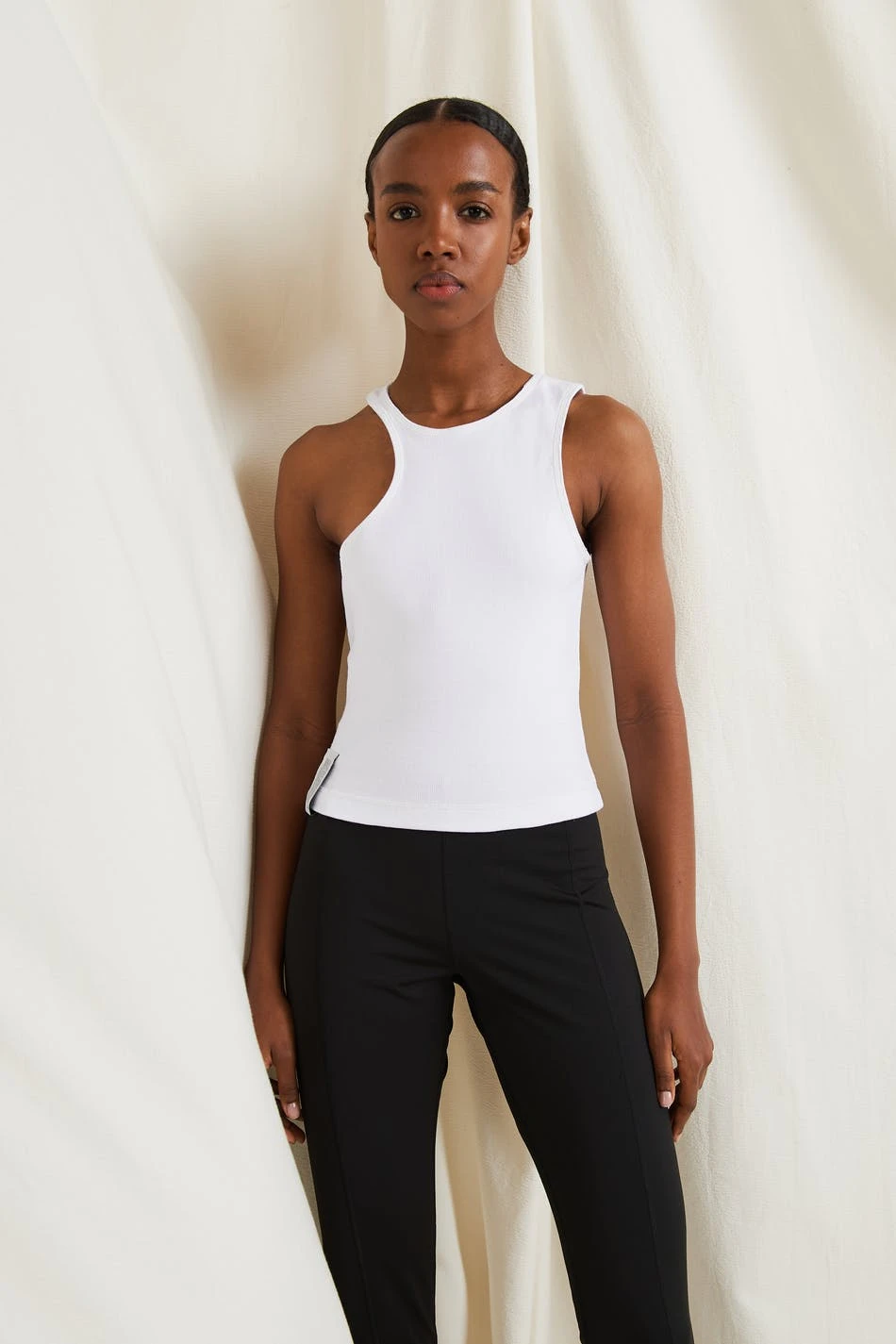 Cutout top by Gina Lab with fitted fit. The top is white and has a soft, ribbed quality. It has asymmetrical cut.
