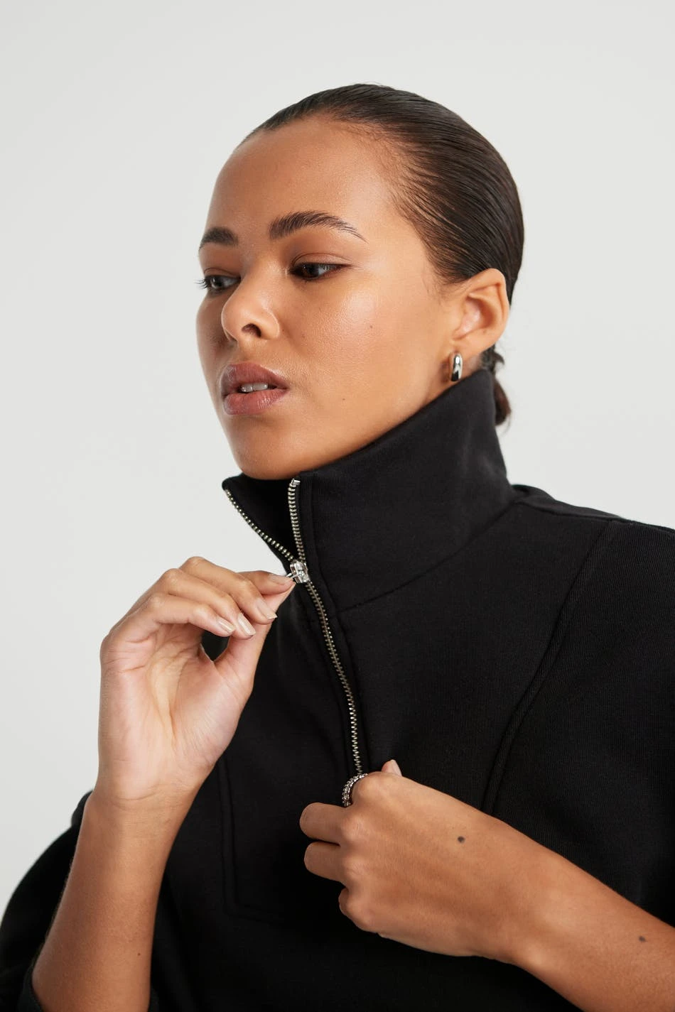 Cropped jumper with an oversize fit. The jumper is black and has a zip to the neck.
