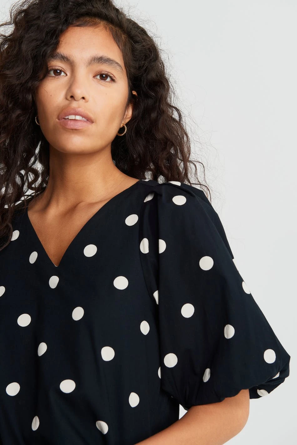 Dotted blouse with short puff sleeves. The blouse is black and white and has rounded edges.