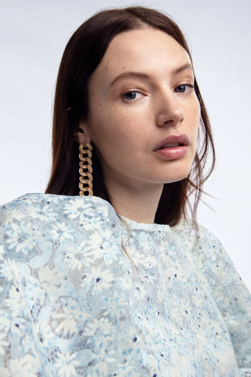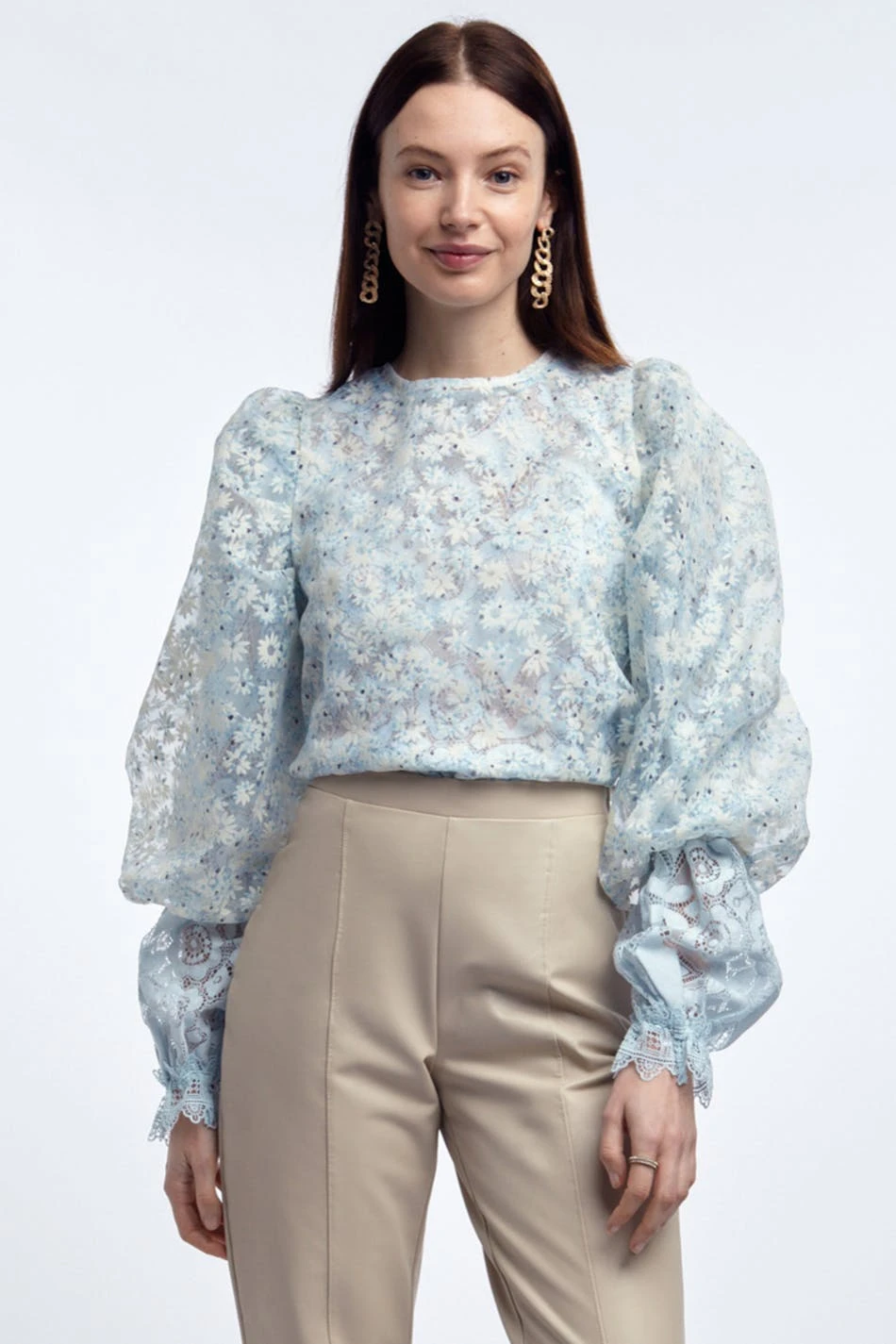 Woven organza blouse with 3/4 length puff sleeves. Tie at back neck. Supplier: Kardem Tekstil San ve Tic A.S. Production unit: Dilateks Giyim San. Tic. VeLtd. Sti.