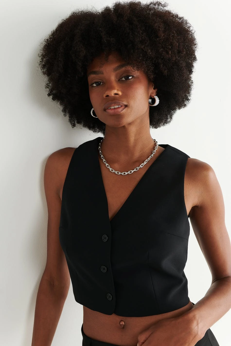 Blazer vest with fitted fit. The waistcoat is black and has button placket in front. It has v-neck cut and welt pockets.