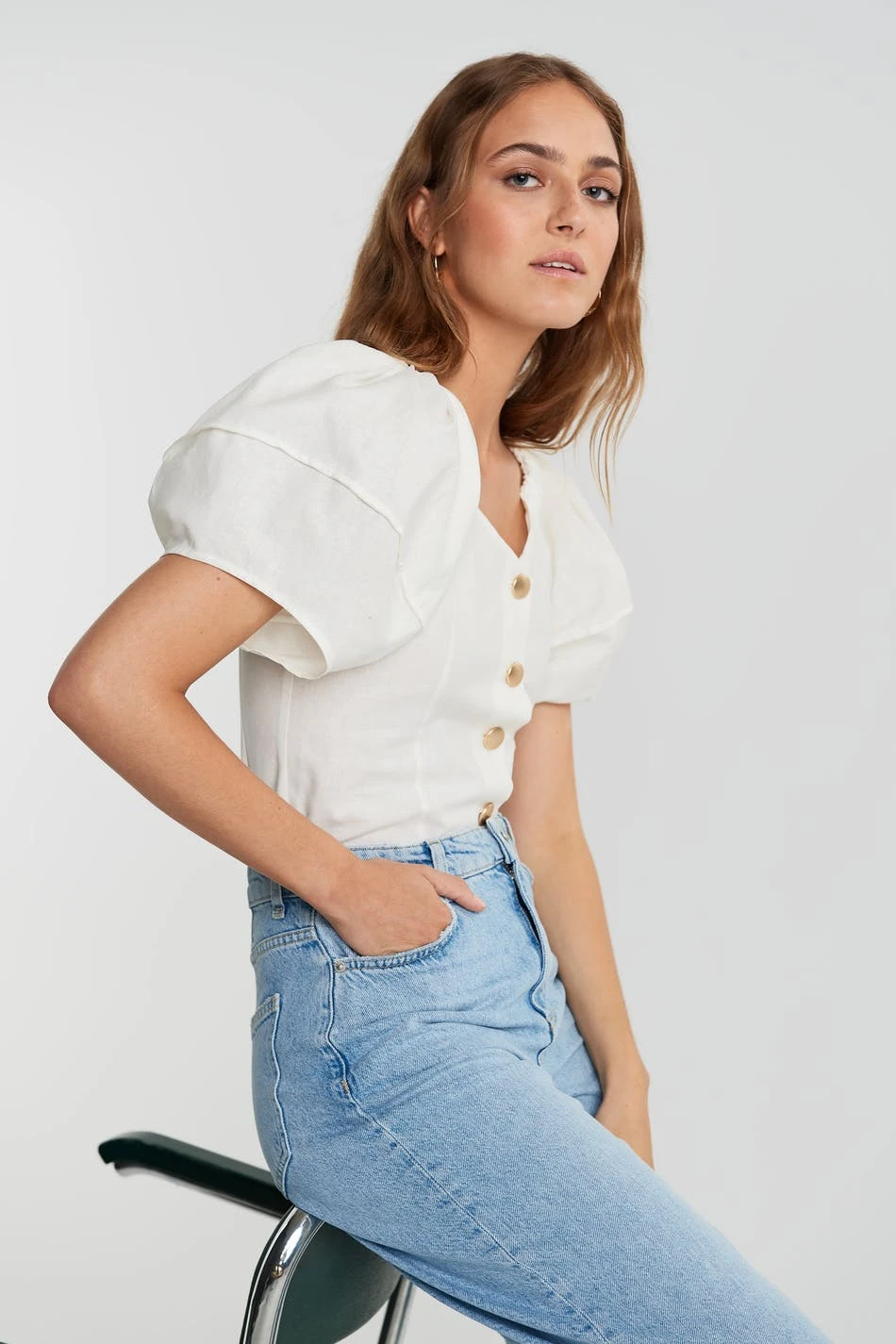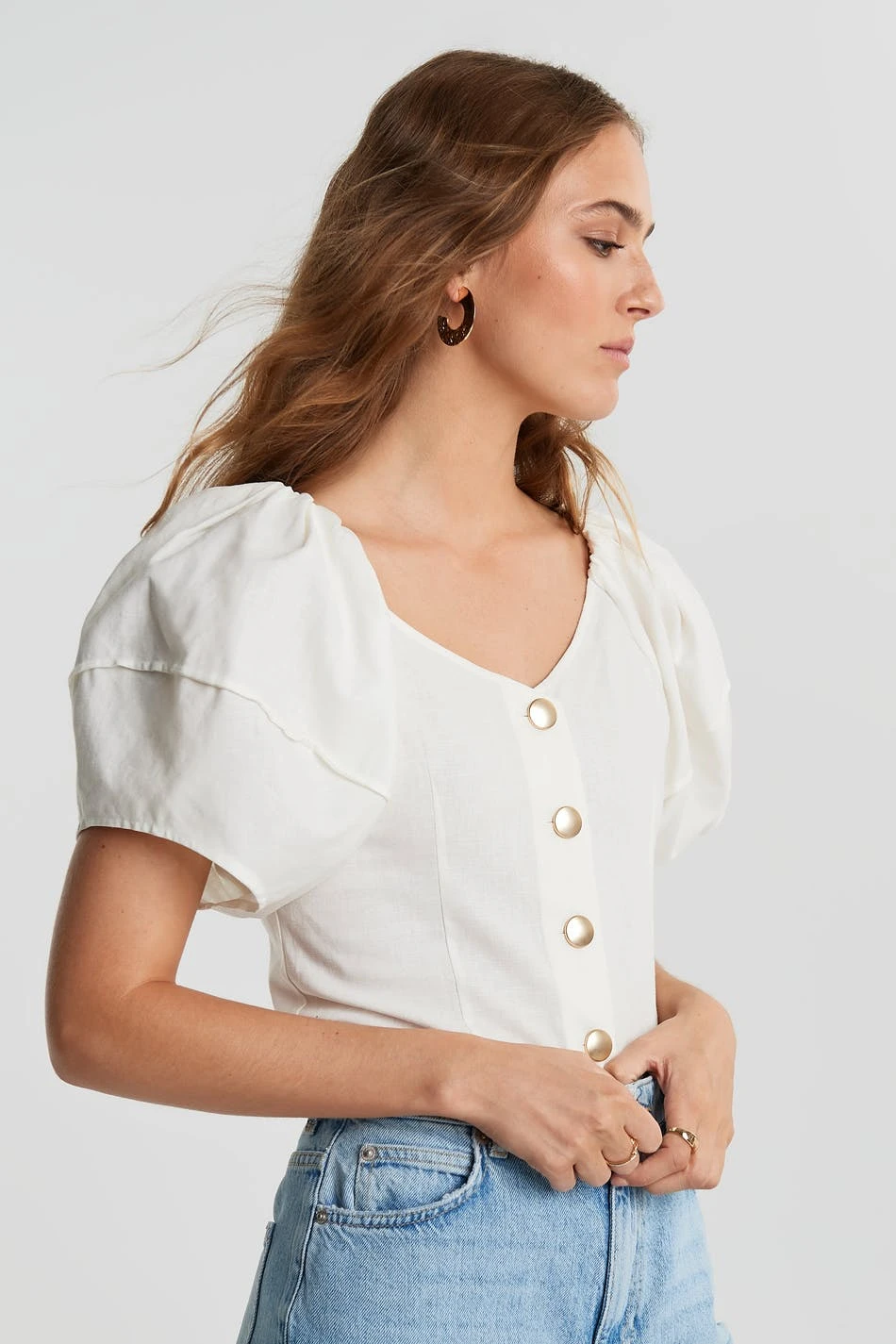 Blouse with short, big puff sleeves with seam details. The blouse is white and has gold coloured buttons at the front.