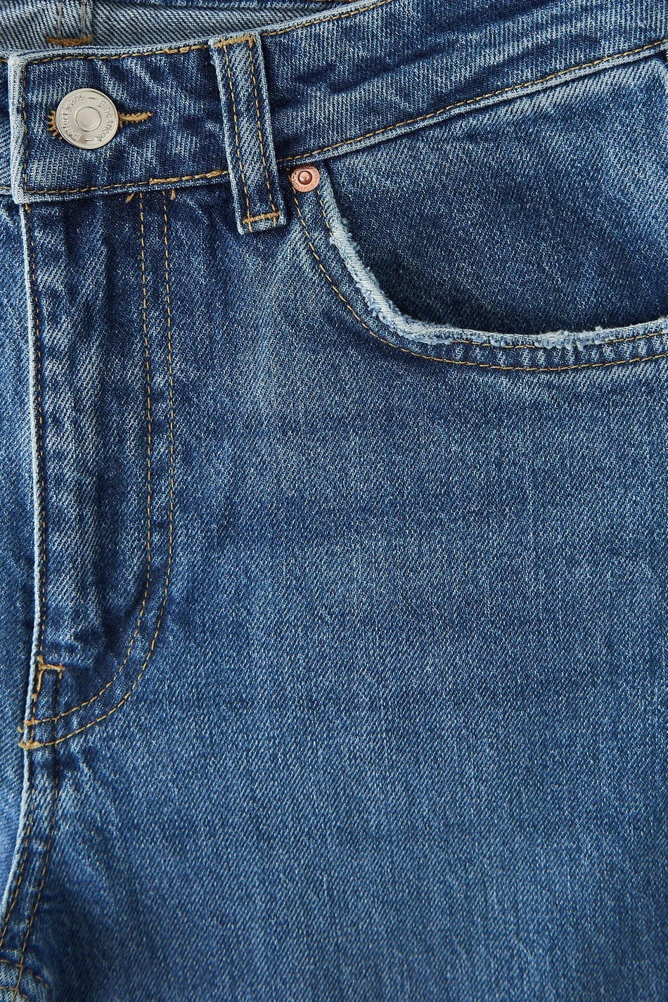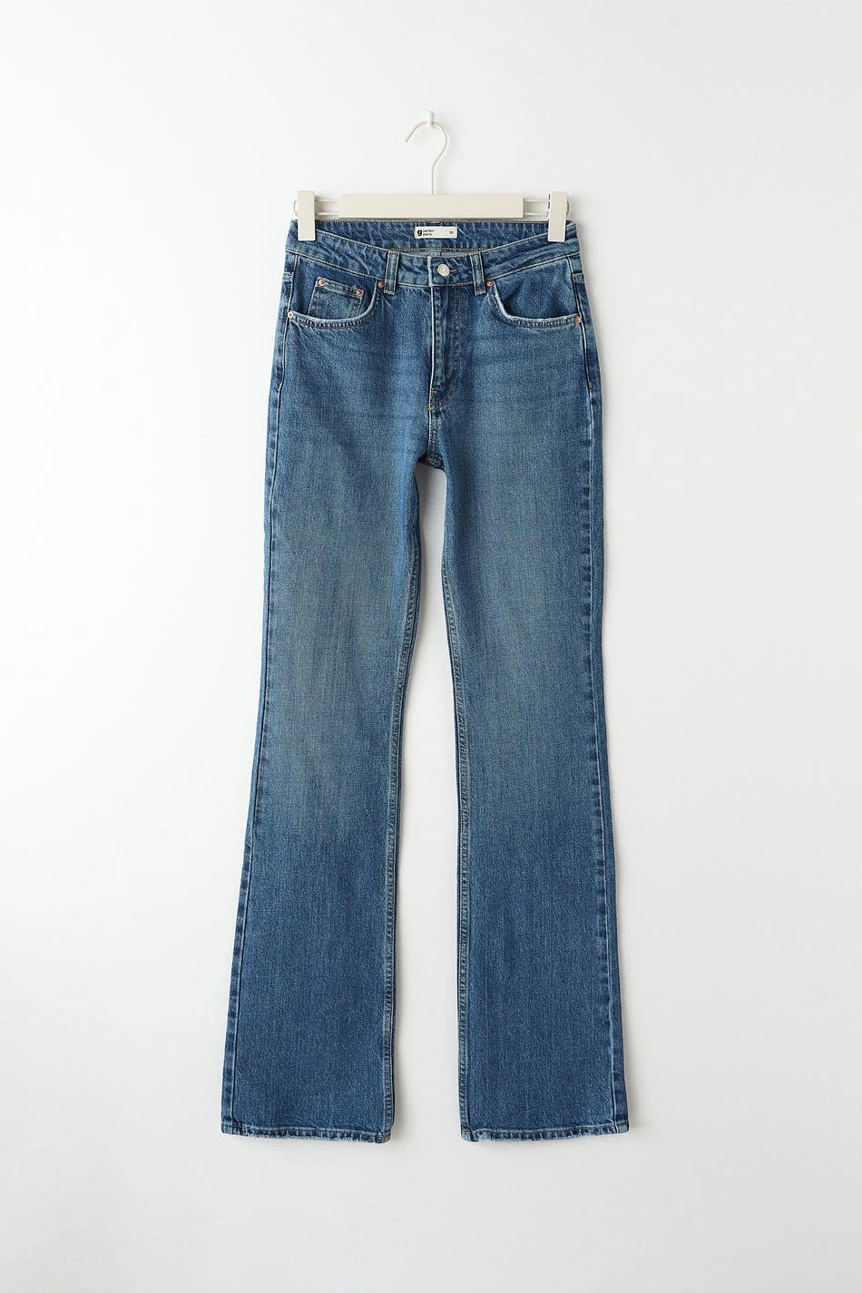 Boot cut jeans with slim fit in low stretch denim. The jeans is dark blue and has mid waist. It has flared trouser legs with full length, fly with zip, raw hemline at the bottom and extra long leg length. Perfect for those who are 175 cm (5 ft 9 in.) or taller. Use our size guide to find your size.