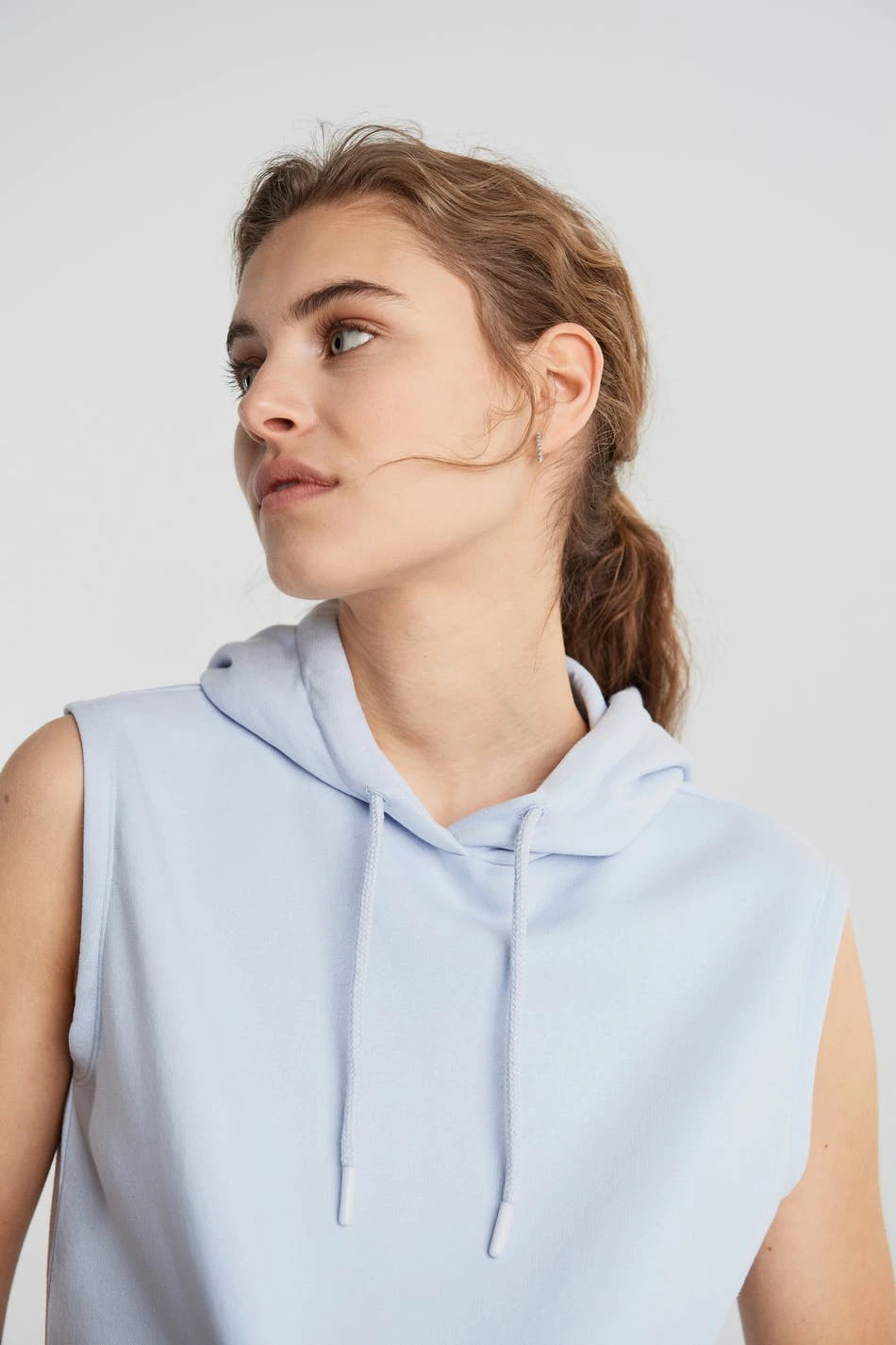 Sleeveless hoodie with a fitted fit. The hoodie is blue, cropped and lined. It has a hood with a drawstring.