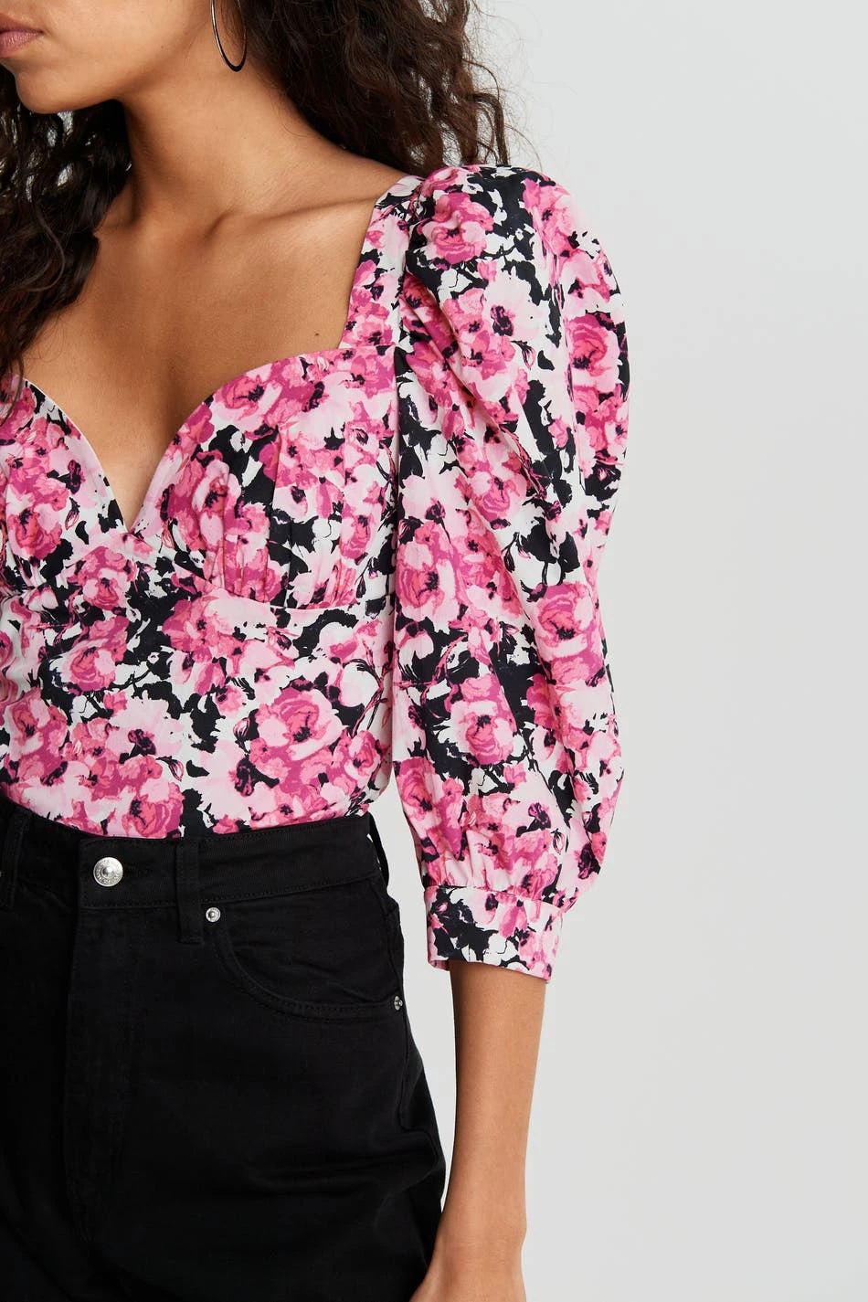 Top with a flower pattern and a fitted fit. The top is perfect for the party and pink and has a plunging sweetheart neckline. It has 3/4 length balloon sleeves.