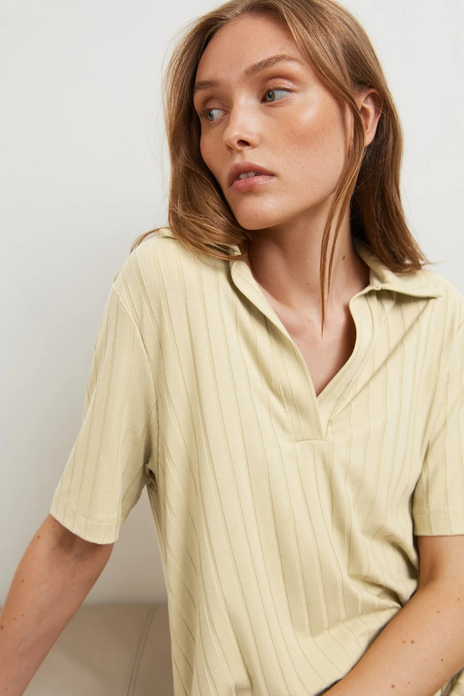 Ribbed dress with an oversize fit. The dress is beige and has a slit on the sides. It has midi length, short sleeves, a V-neck and a collar.