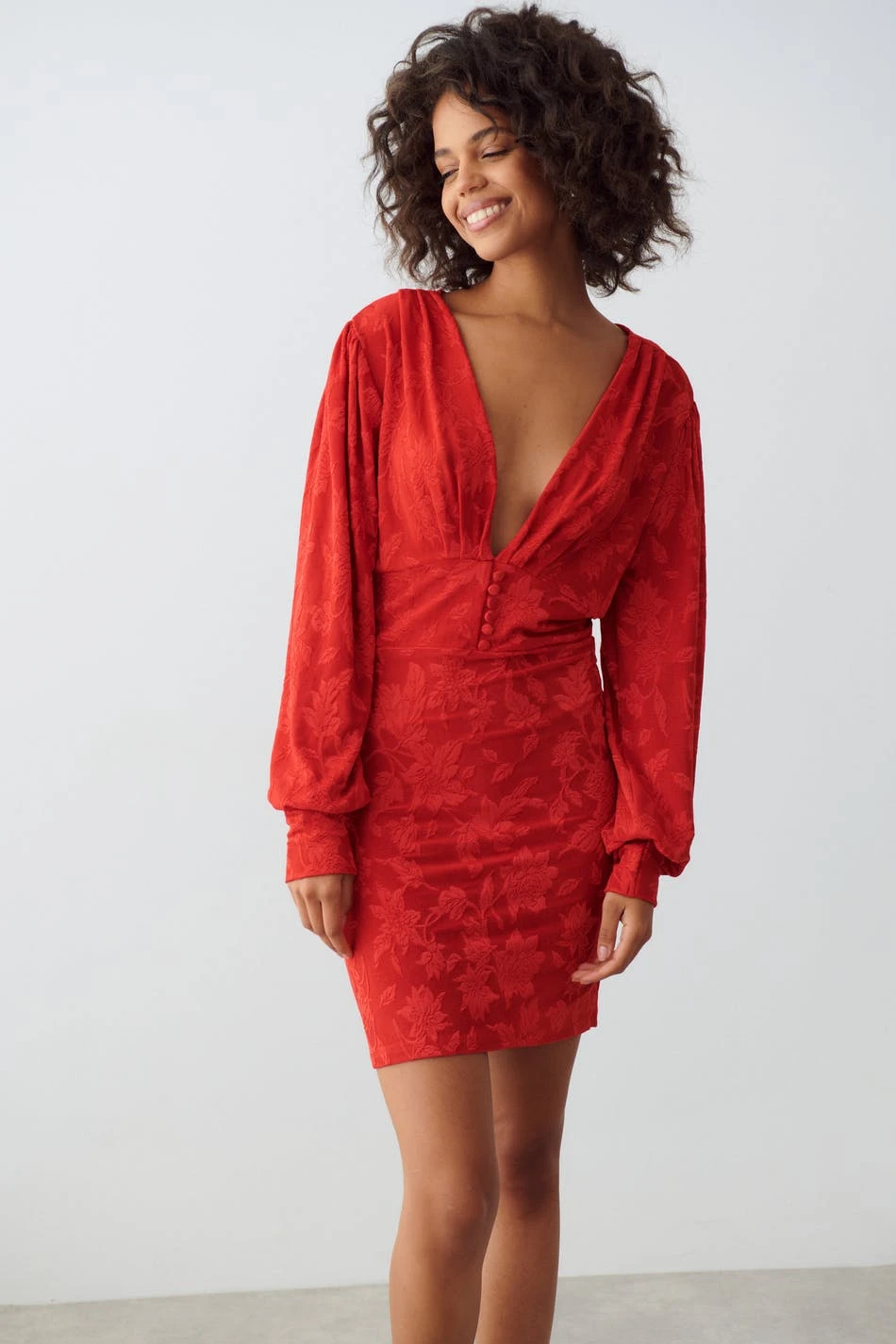 Short dress in jersey with balloon sleeves. The dress is red and has plunge neckline with pleats. It has a stretchy, textured material and decorative buttons at the front.