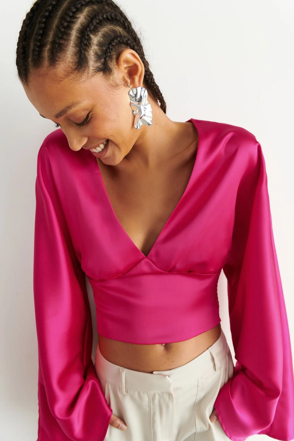 Long-sleeved satin blouse with v neckline. The satin blouse is pink and has a fitted waist. It has loose, flared sleeves, cropped length, smocking at the back and a decorative seam detail below the bust.
