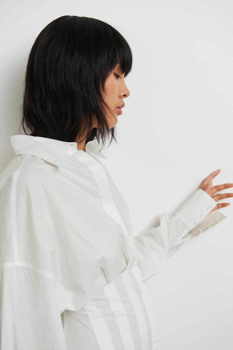 Short shirt dress with voluminous upper. The dress is white and has pleat at the waist and below the bust. It has a shirt collar with buttons at the front and cuffs on the sleeves.