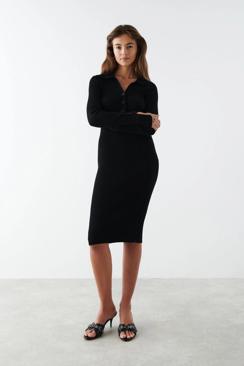 Knitted dress with collar. The dress is black, long-sleeved and ribbed. It has v-neck cut with button closure, fitted fit and high slit with button on the sleeve ends.
