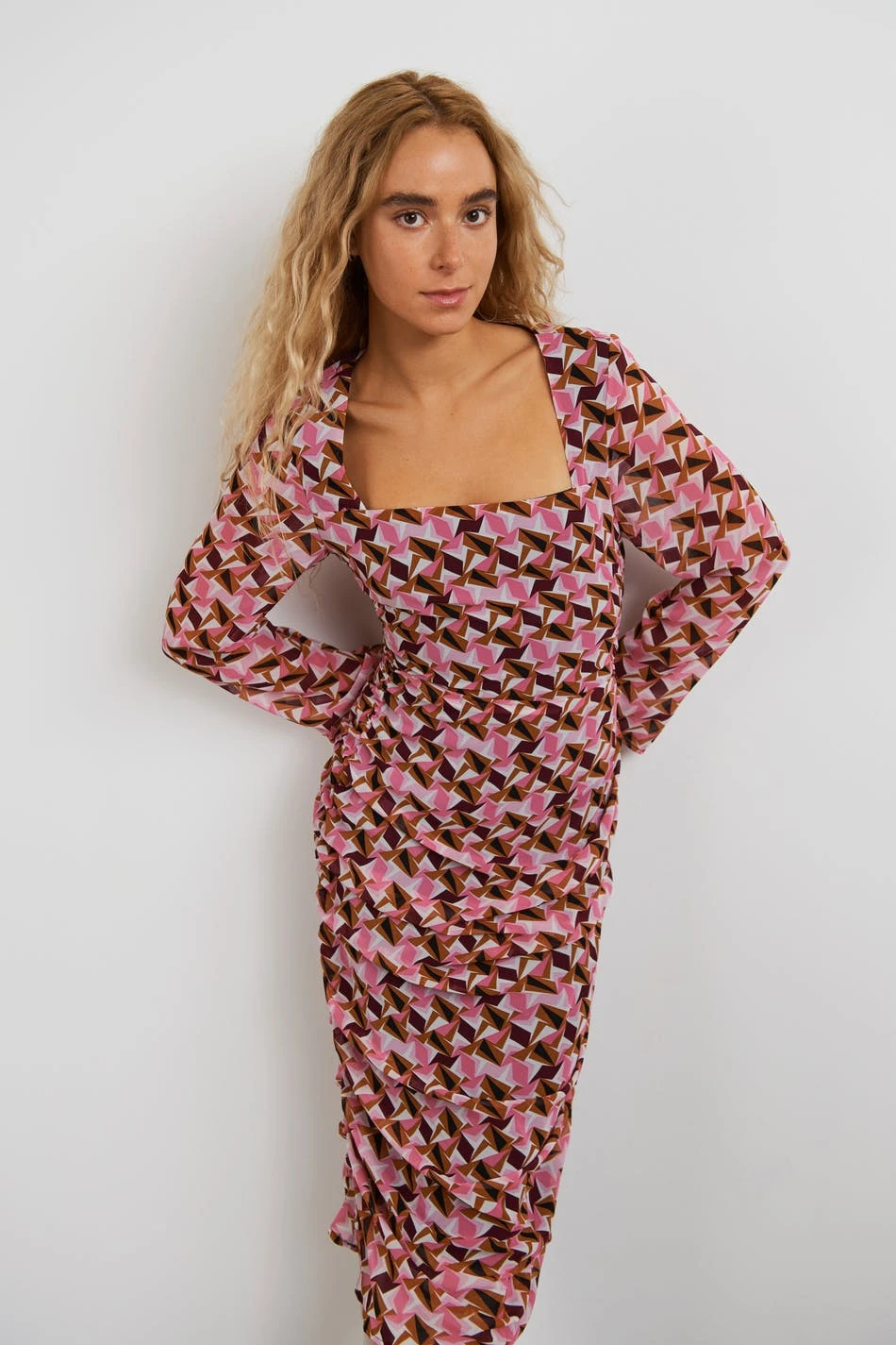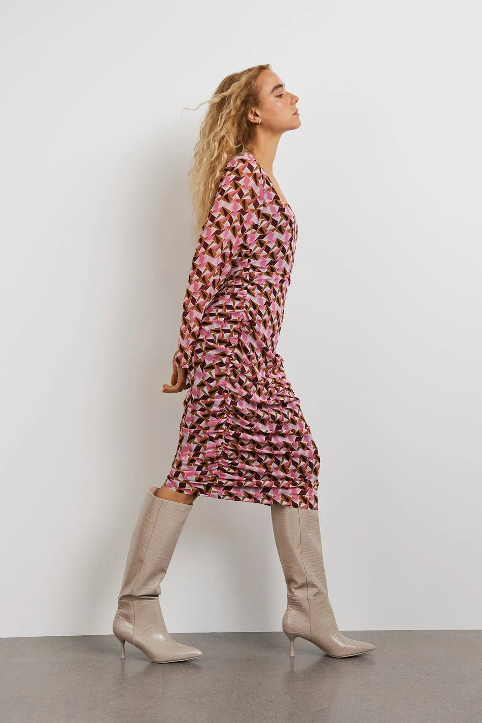 Patterned dress with gathered details. The dress is perfect for the party, pink and long-sleeved. It has slit on the sleeve ends, a square neckline and midi length.