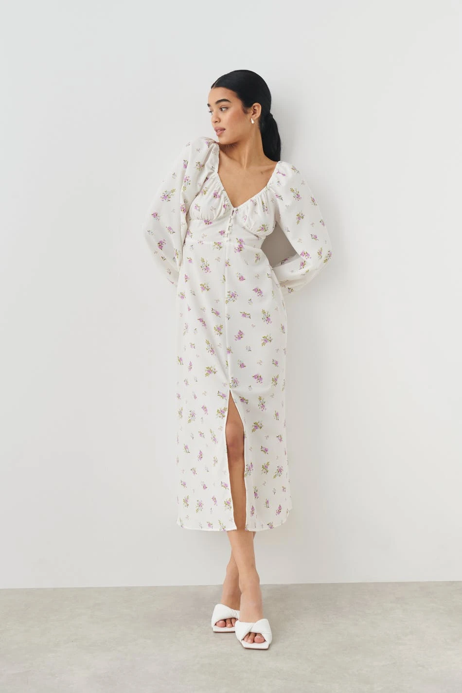 Floral maxi dress with ruched bust. The dress is white, pink and long-sleeved. It has slit at the front, fitted waist, puff sleeves, buttons at the front, smocking in the back, seam detail below the bust and gathering on the sleeve ends and around the shoulders.