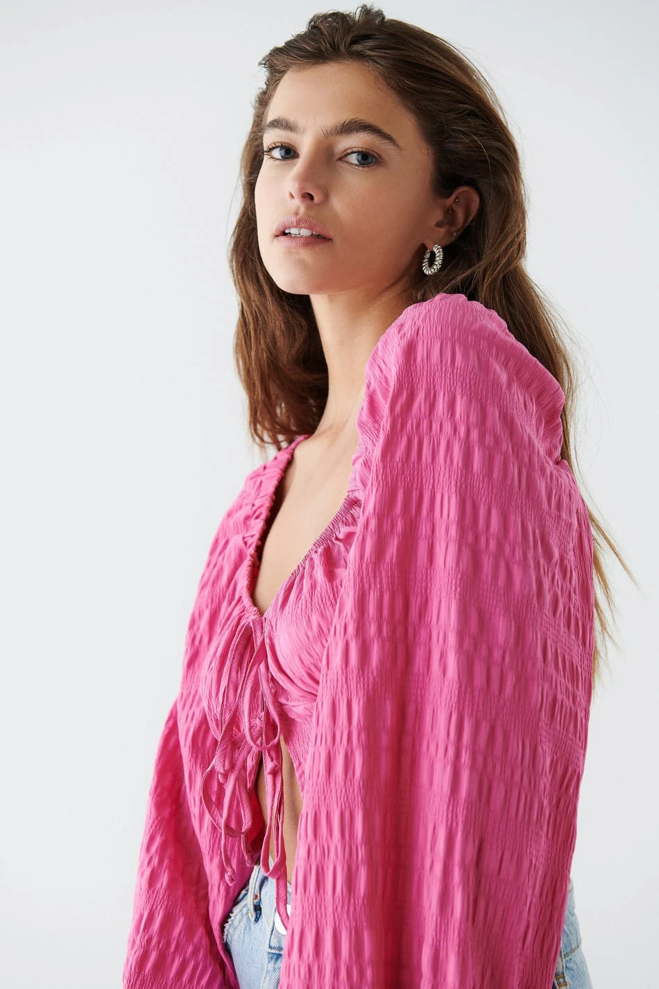 Cropped blouse with long puff sleeves. The blouse is pink and has square neckline. It has a structured material, fitted fit, knot details at the front, smocking in the back and elastic on the sleeve ends and at the shoulders.
