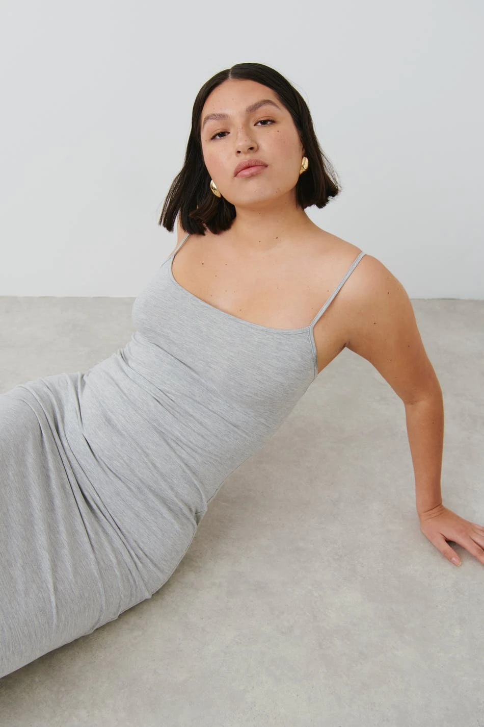 Sleeveless maxi dress in jersey with thin shoulder straps. The dress is grey and has figure-hugging fit with gently flared skirt.