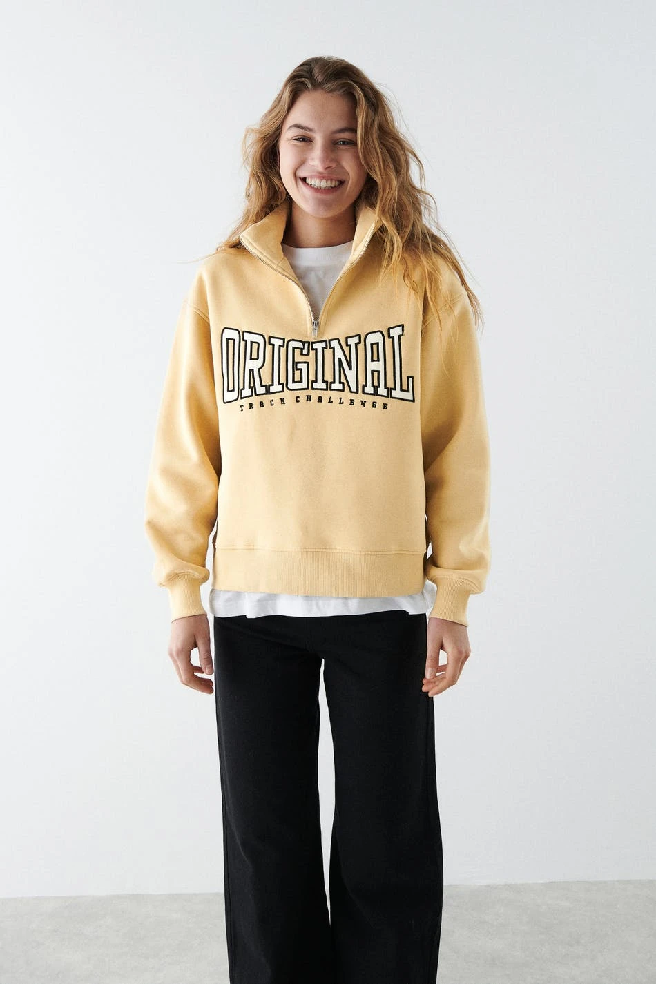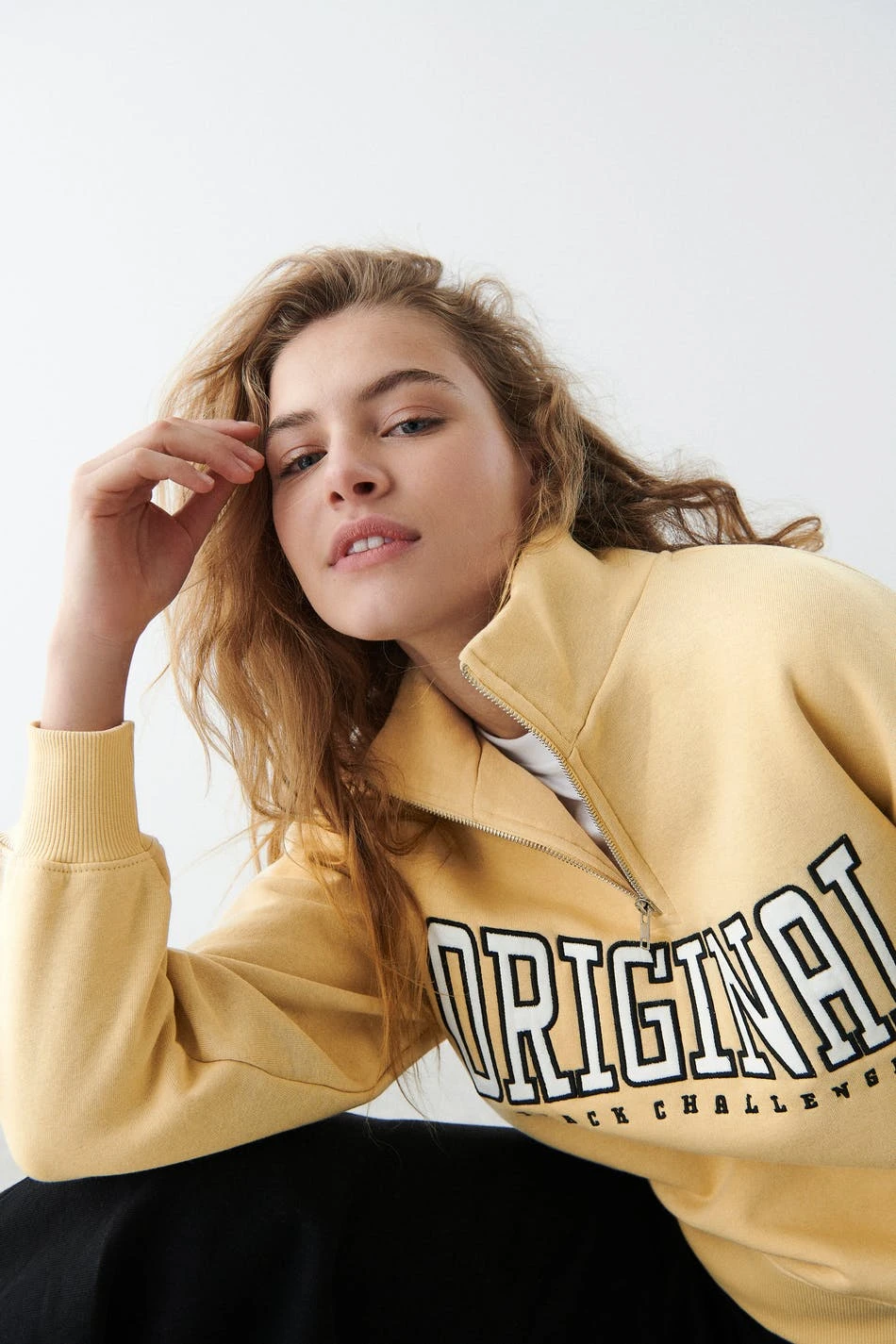 Jumper with embroidered text. The jumper is yellow and has an oversize fit. It has dropped shoulders, a ribbed hem and a high collar with zip.
