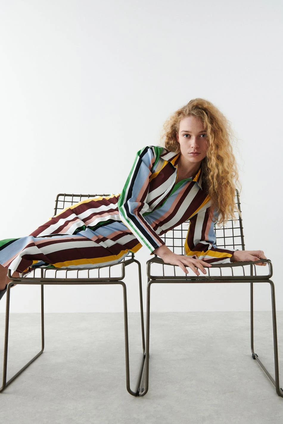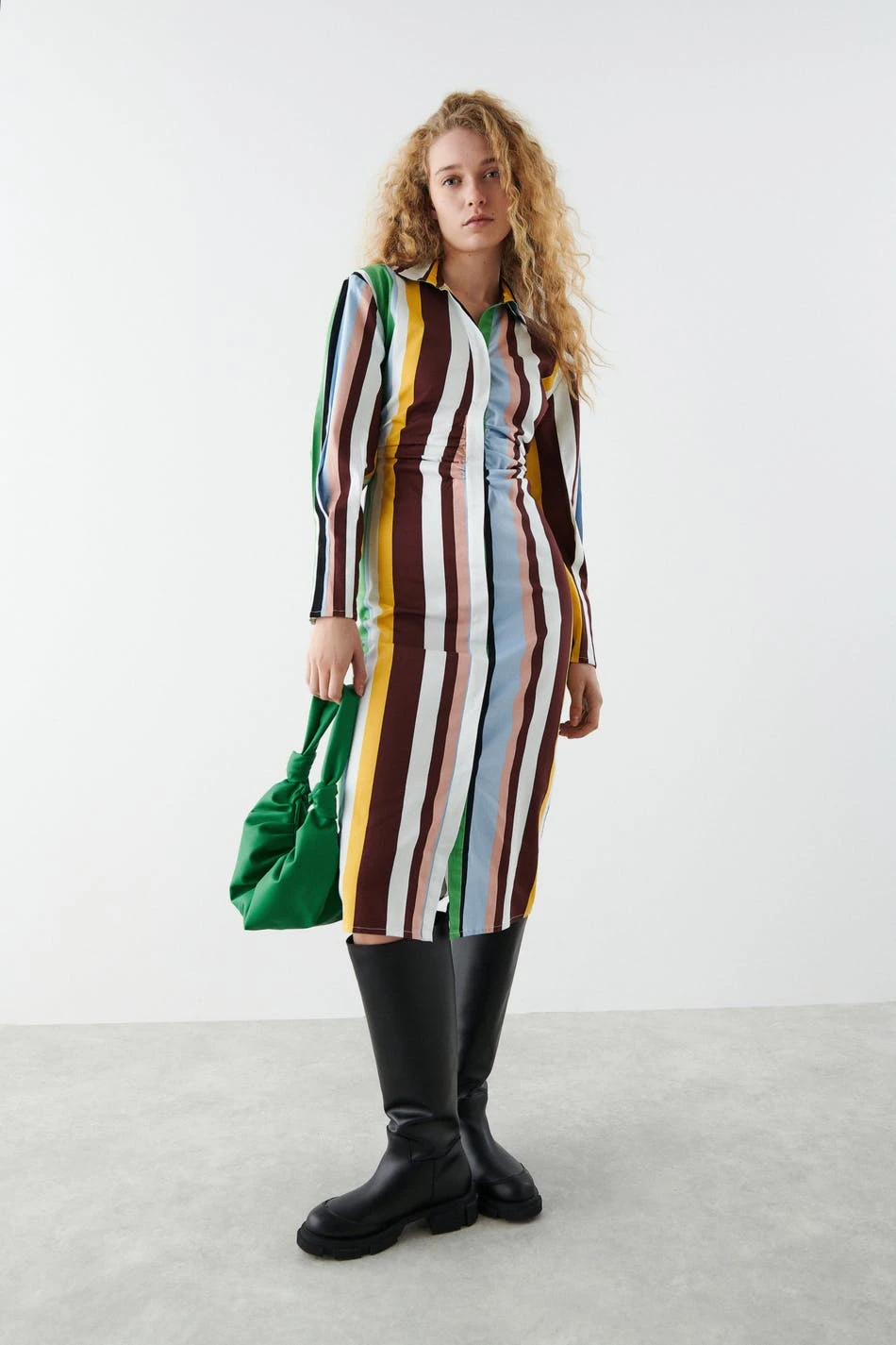 Striped shirt dress with a sculpting fit. The dress is green, yellow and blue. It has a collar, button placket in front and gathered details at the waist.