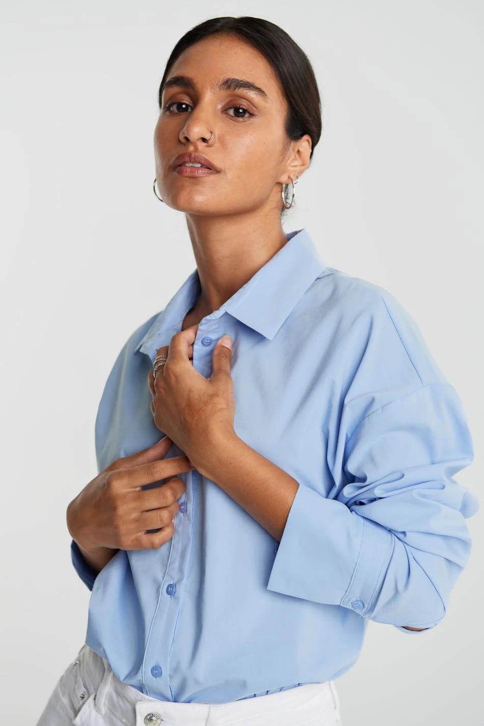 Woven oversized shirt with collar and buttons along front. Rounded at bottom. Thank you for supporting more sustainably grown cotton through the Better Cotton Initiative.