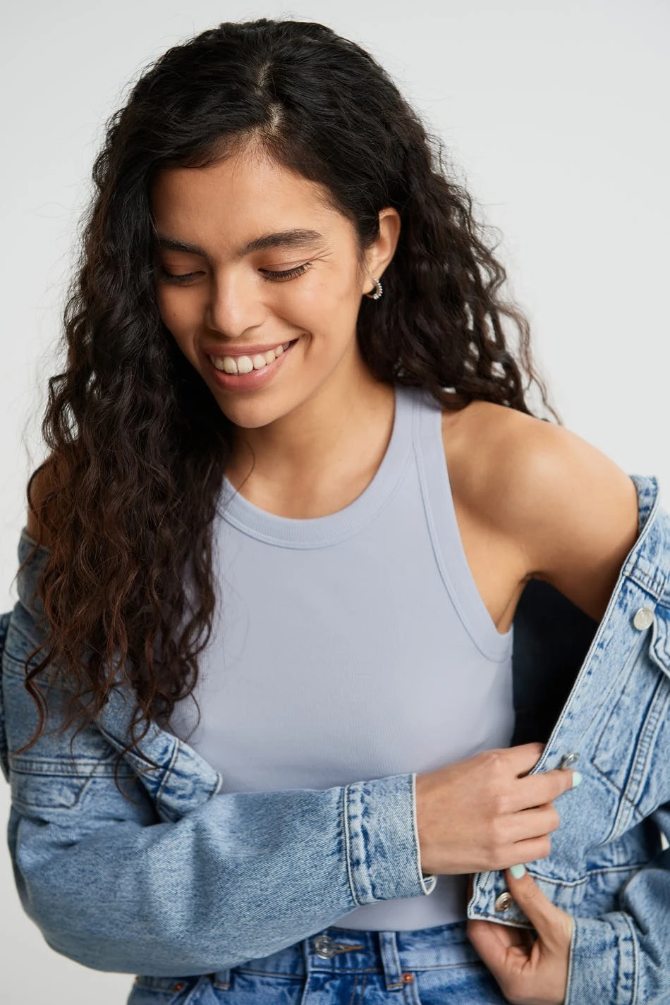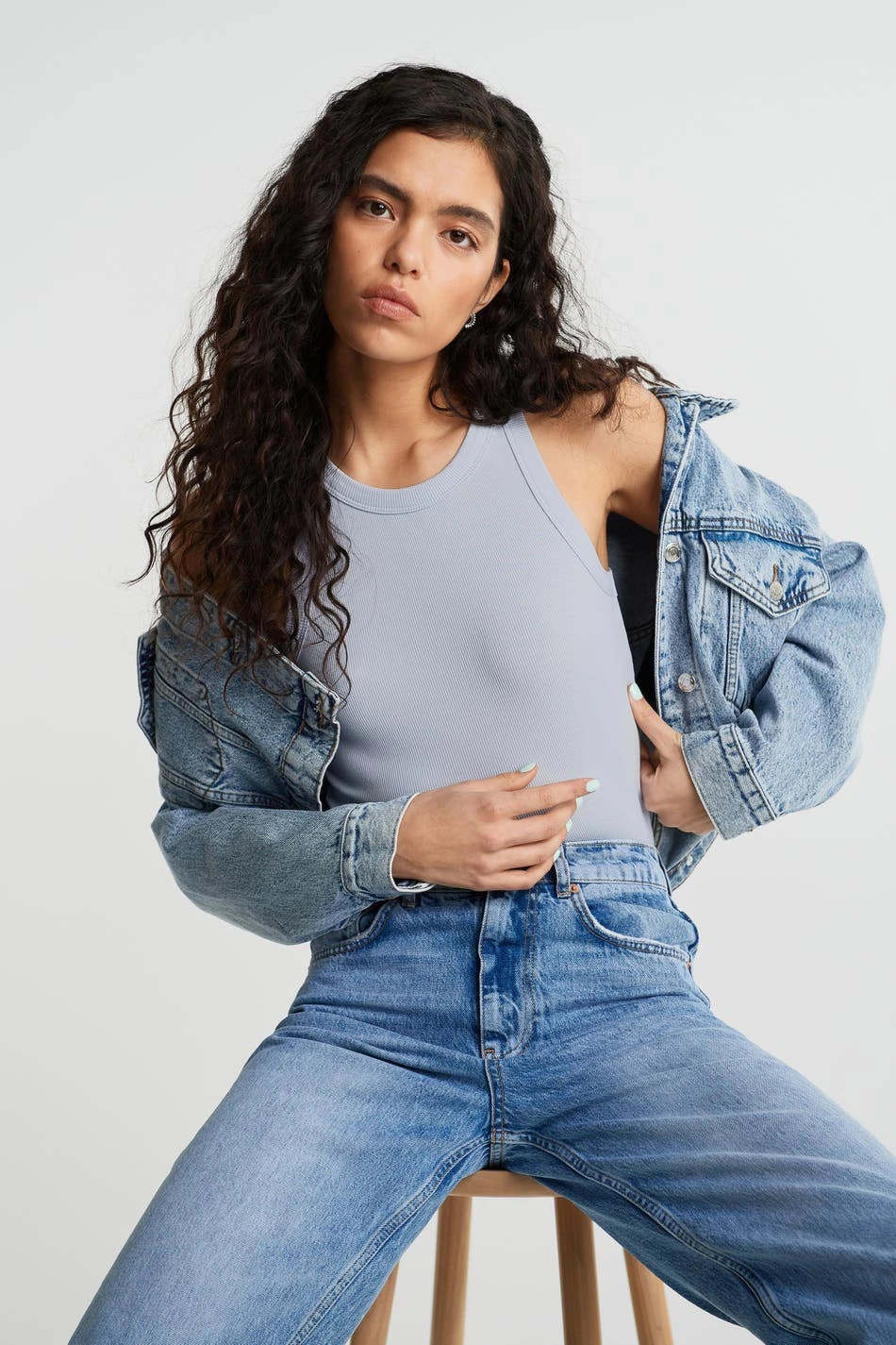 Rib-knit tank with a fitted fit. The tank is blue.