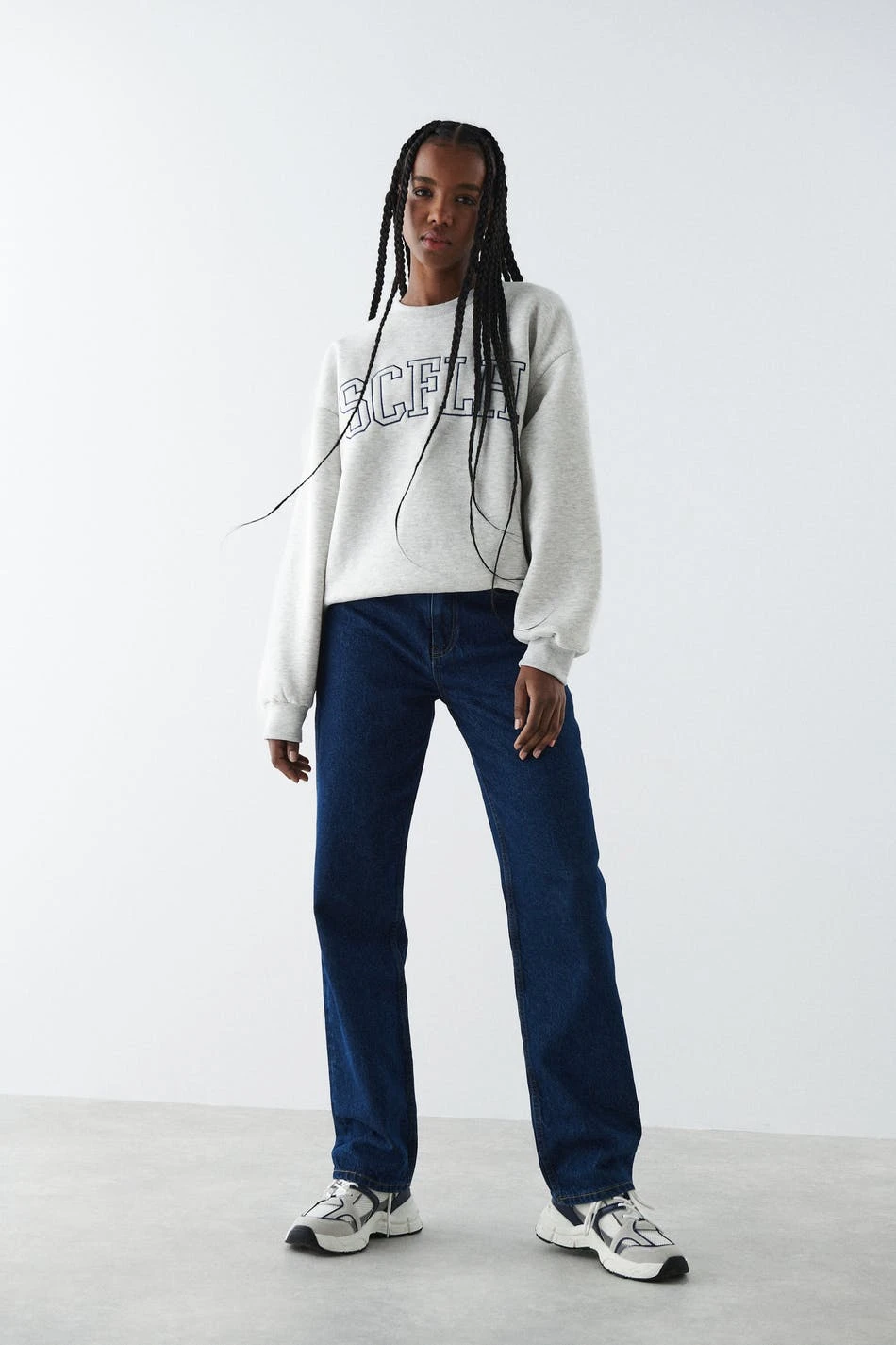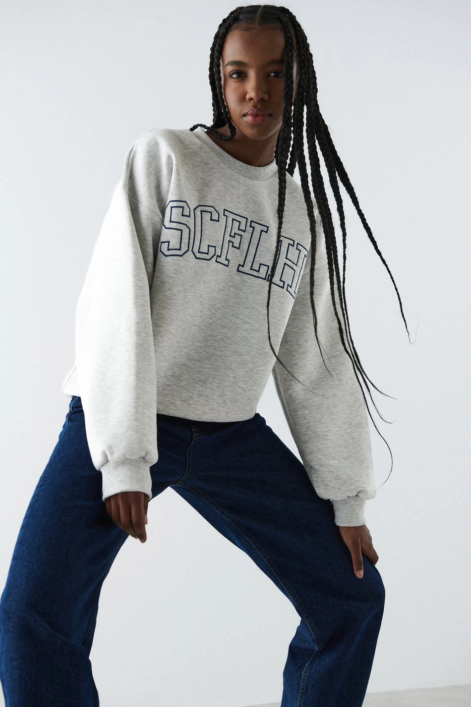 Sweatshirt with sporty print. The sweatshirt is grey and has an oversize fit. It has a rounded neckline and a ribbed cuff on the sleeve ends and at the bottom hem.