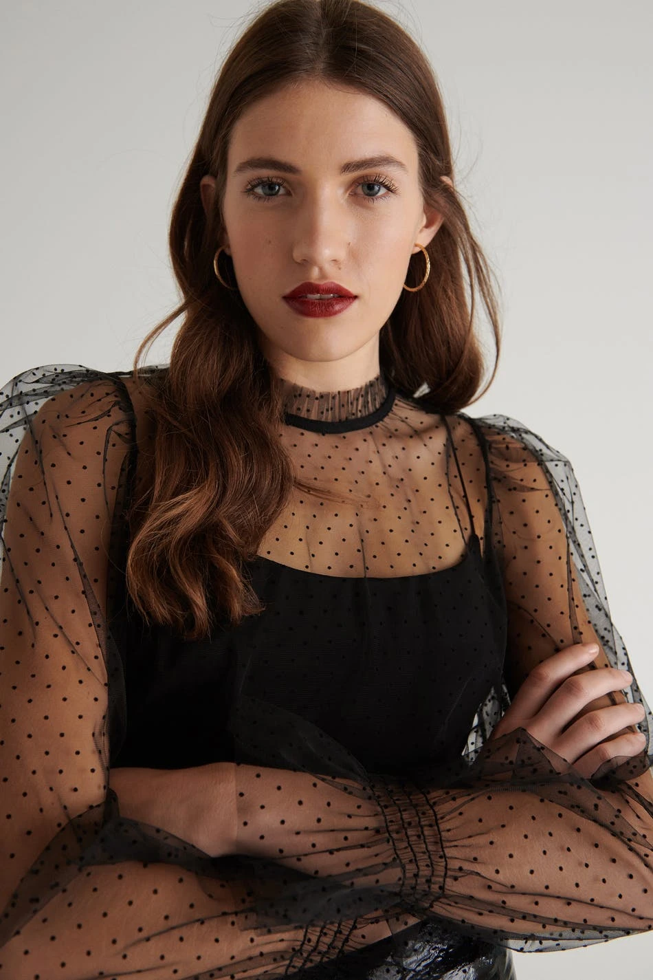 Jersey top. With dots. Transparent. Wear it with a cool bra for a more stylish look. Supplier: Kardem Tekstil San ve Tic A.S. Production unit: Dilateks Giyim San. Tic. VeLtd. Sti.