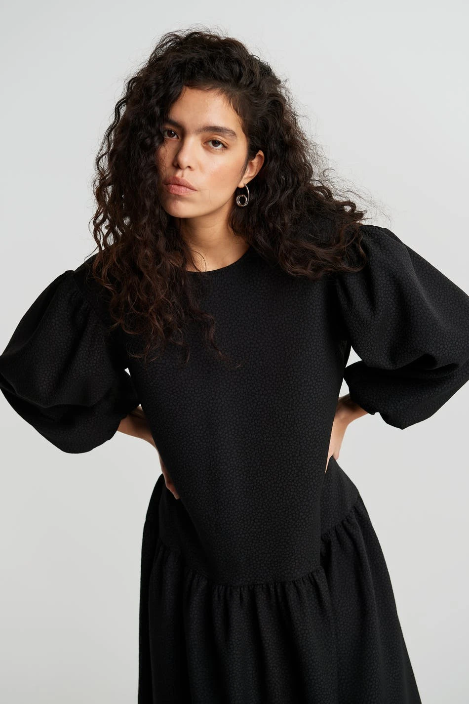 Treaded dress with big, 3/4 length puff sleeves. The dress is black and has gathering on the skirt. It has a self-tie at the neck and midi length.