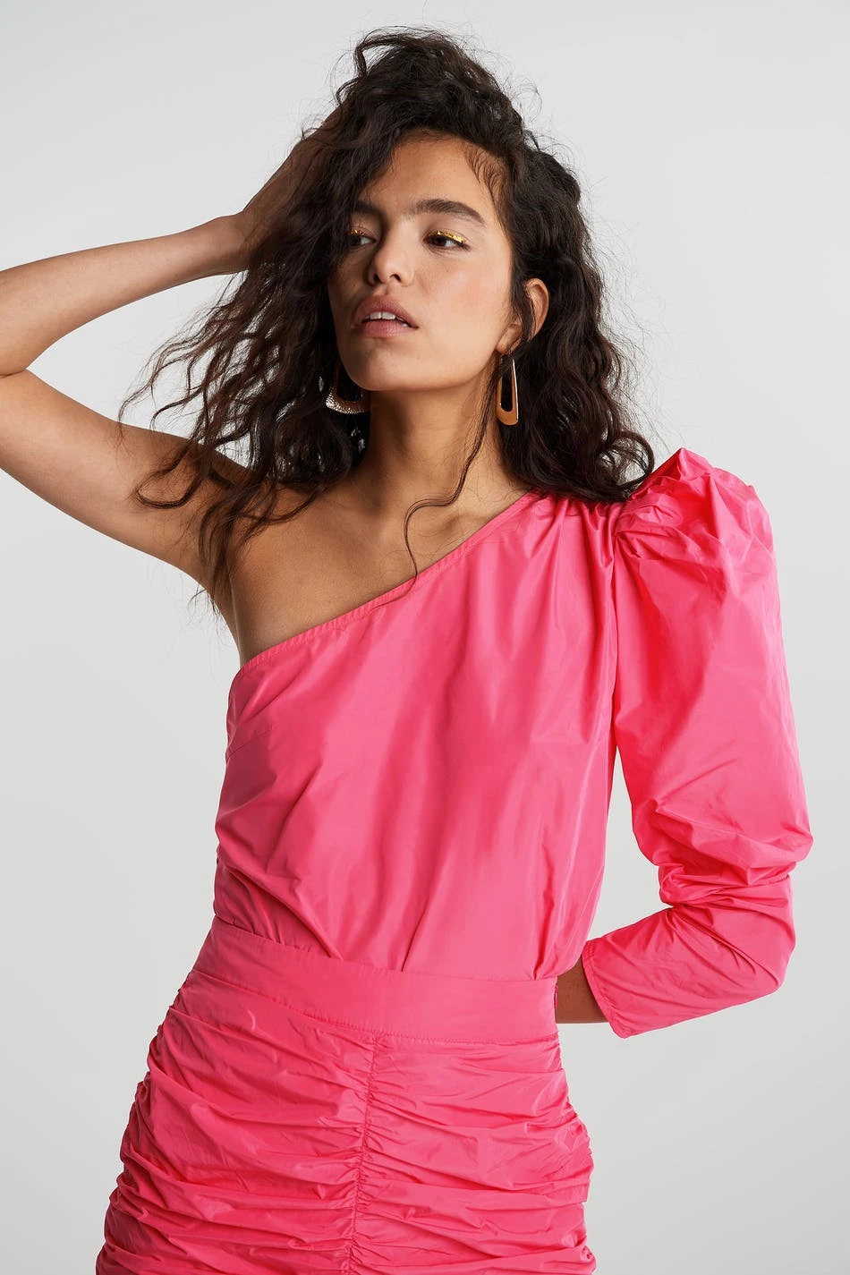 One shoulder top with a long puff sleeve. The top is perfect for the party and pink and has ruching on one shoulder.