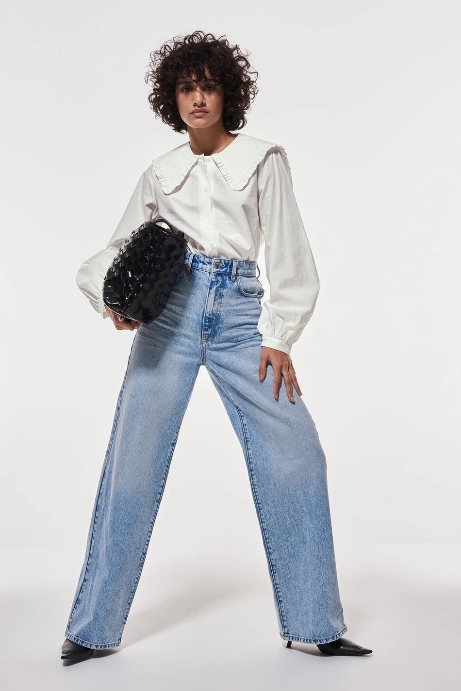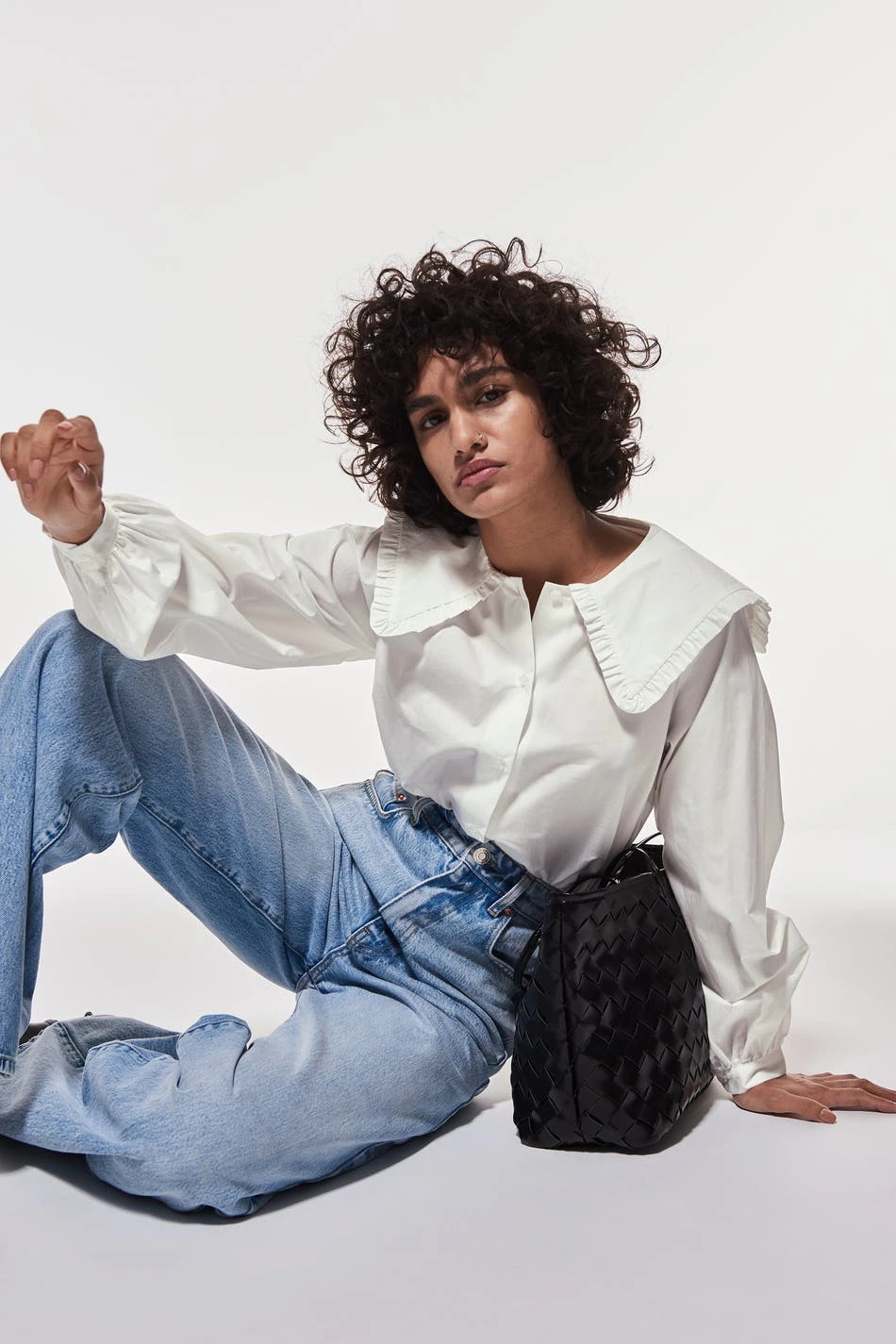 Woven blouse with big collar. Ruffles at collar edge. Long sleeves with small puff. Thanks for supporting more sustainably grown cotton through the Better Cotton Initiative. Supplier: Nantong D&J Fashion Co, Limited Production unit: Donghai Yiting fashion Co. Ltd