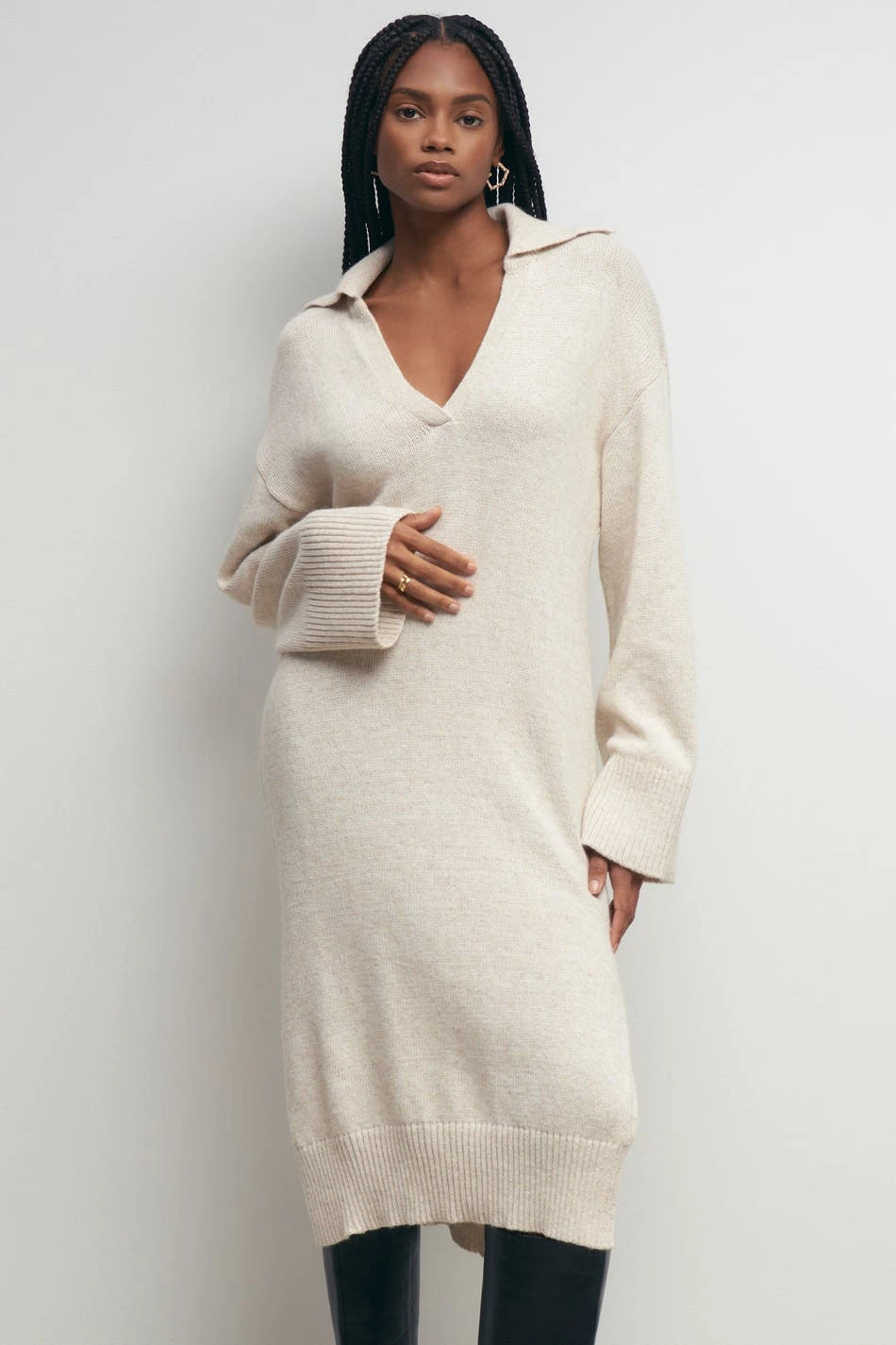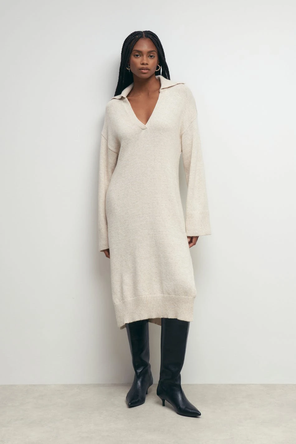 Long-sleeved knit dress with wrapover V-neck. The dress is beige and has loose-fitting style. It has slit in the sides and midi length.