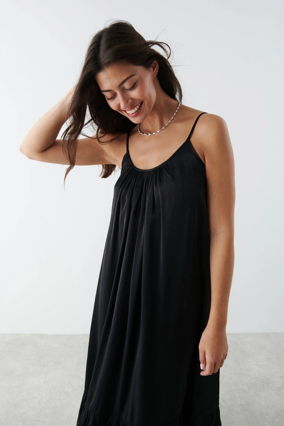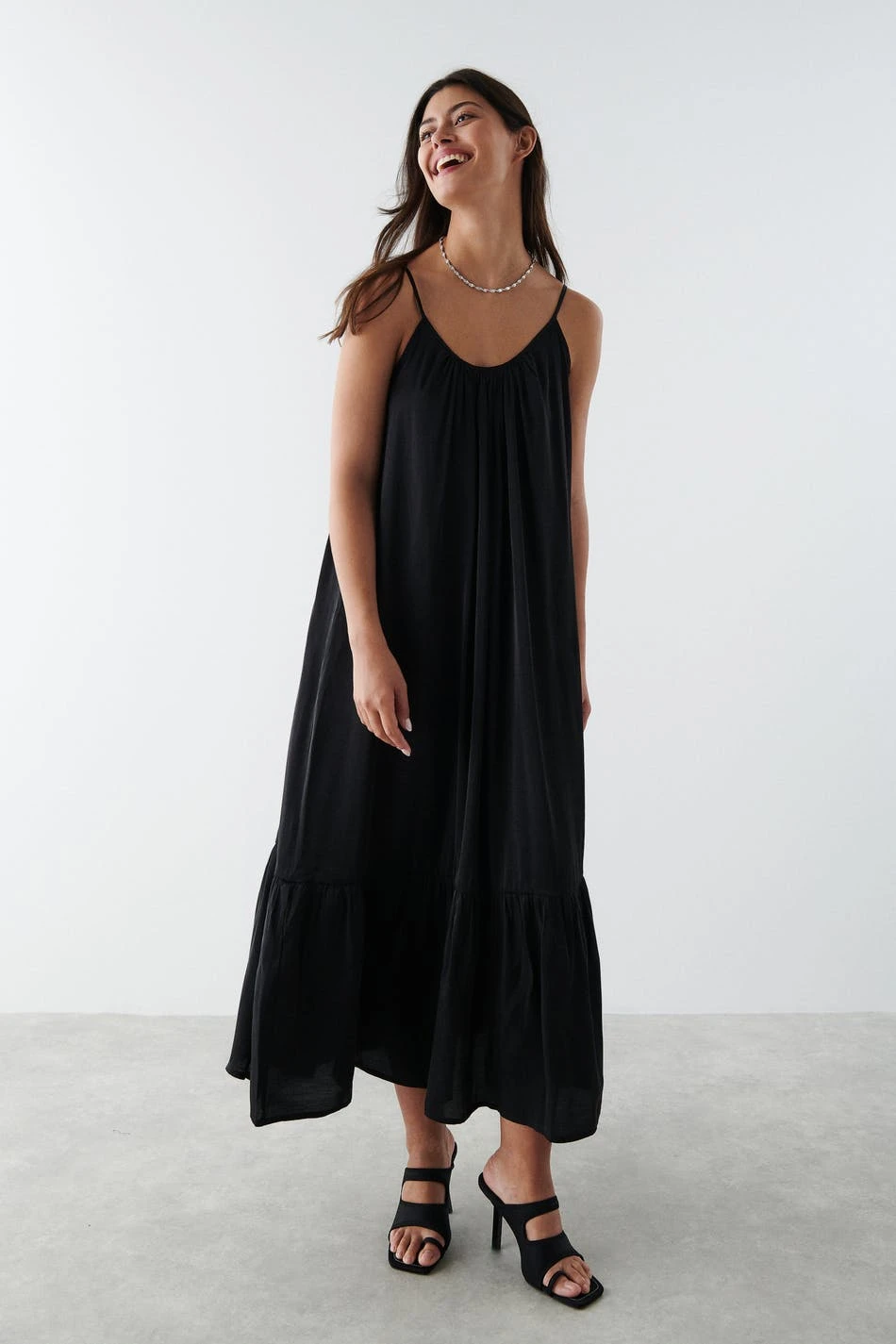 Maxi dress with low backline. The dress is black and has thin, adjustable shoulder straps.