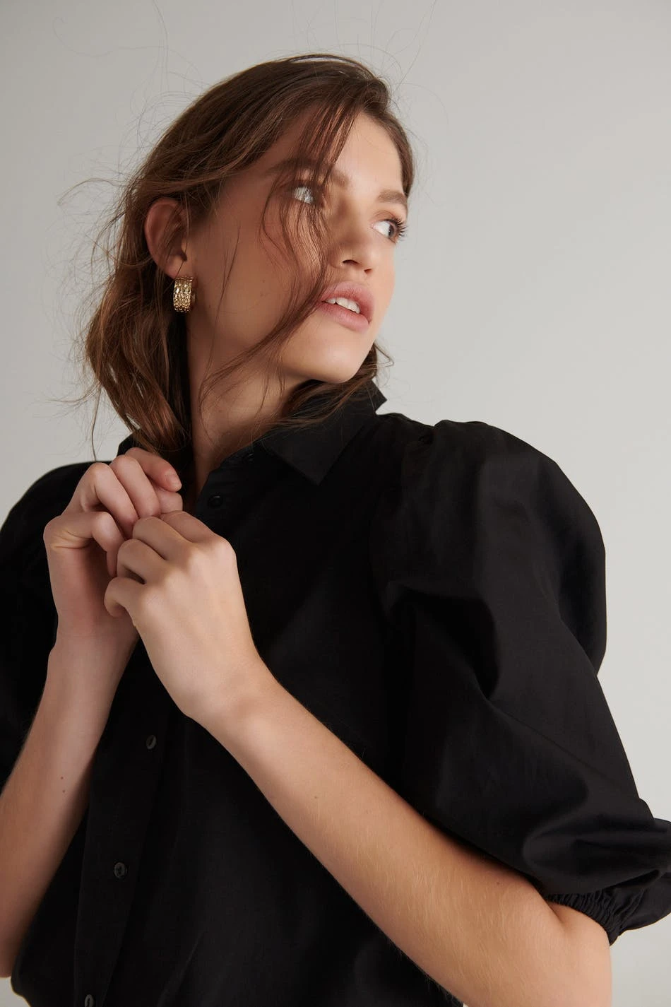 Woven puff sleeve blouse. Buttons along front, small collar. Supplier: Huzi Tekstil Ltd Sti Production unit: Yesim Tekstil-Hulya Karacoban